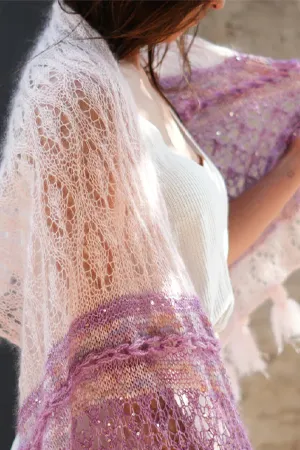 Ethereal Glow is a straight shawl, worked in two seamless parts, that combines simplicity with delicate, eyecatching details. Easy construction makes it perfect for relaxing knitting, yet it plays with different textures and materials keeps it engaging. Throughout the piece, you’ll discover soft mohair, silky threads, and shimmering beads, which create a luminous effect.