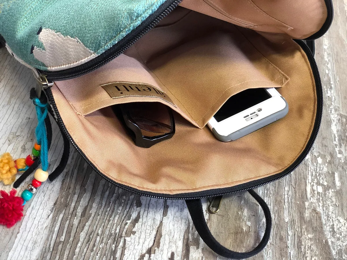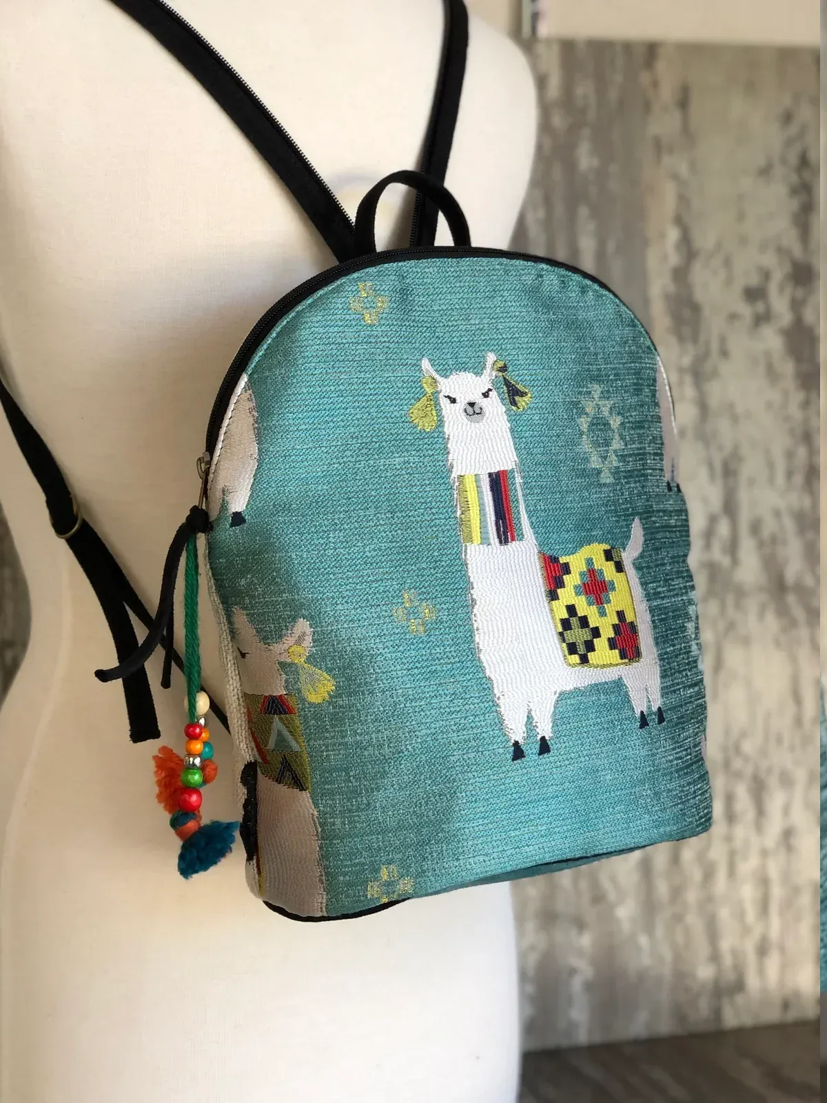 Fun and trendy llamas woven into a jacquard. This small fashionable backpack/shoulder bag has a 16” zipper allows the two straps to fuse into a thicker strap for comfort when using as a shoulder bag. Zipper closure, fully lined with water resistant taffeta. Inside are a zippered pocket and an open divided pocket with a cell phone slot.