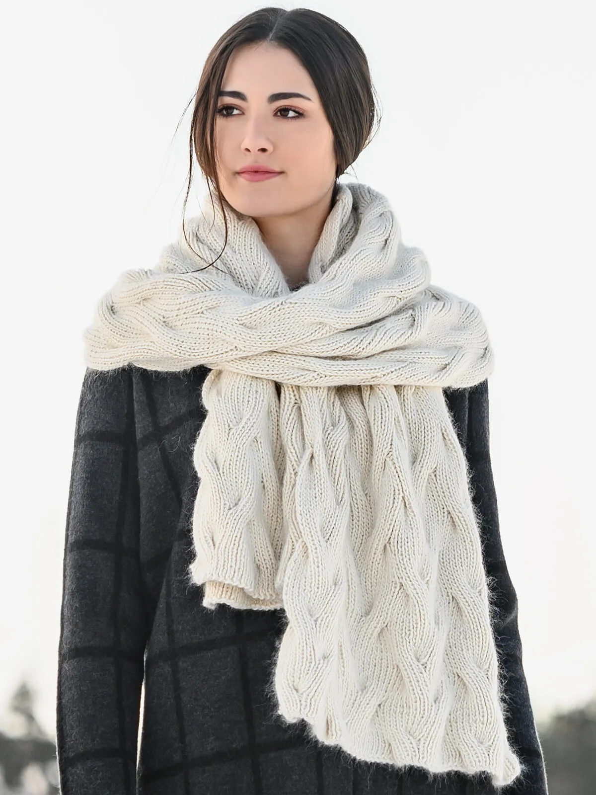 Warmth, elegance and cables make this a piece to keep forever. Knit with luxurious Suri Merino and written for both a wrap or scarf option, select your favorite color and cast on. Sold here as the 6 sk scarf option; if you'd like the larger wrap, order and additional 4 skeins.