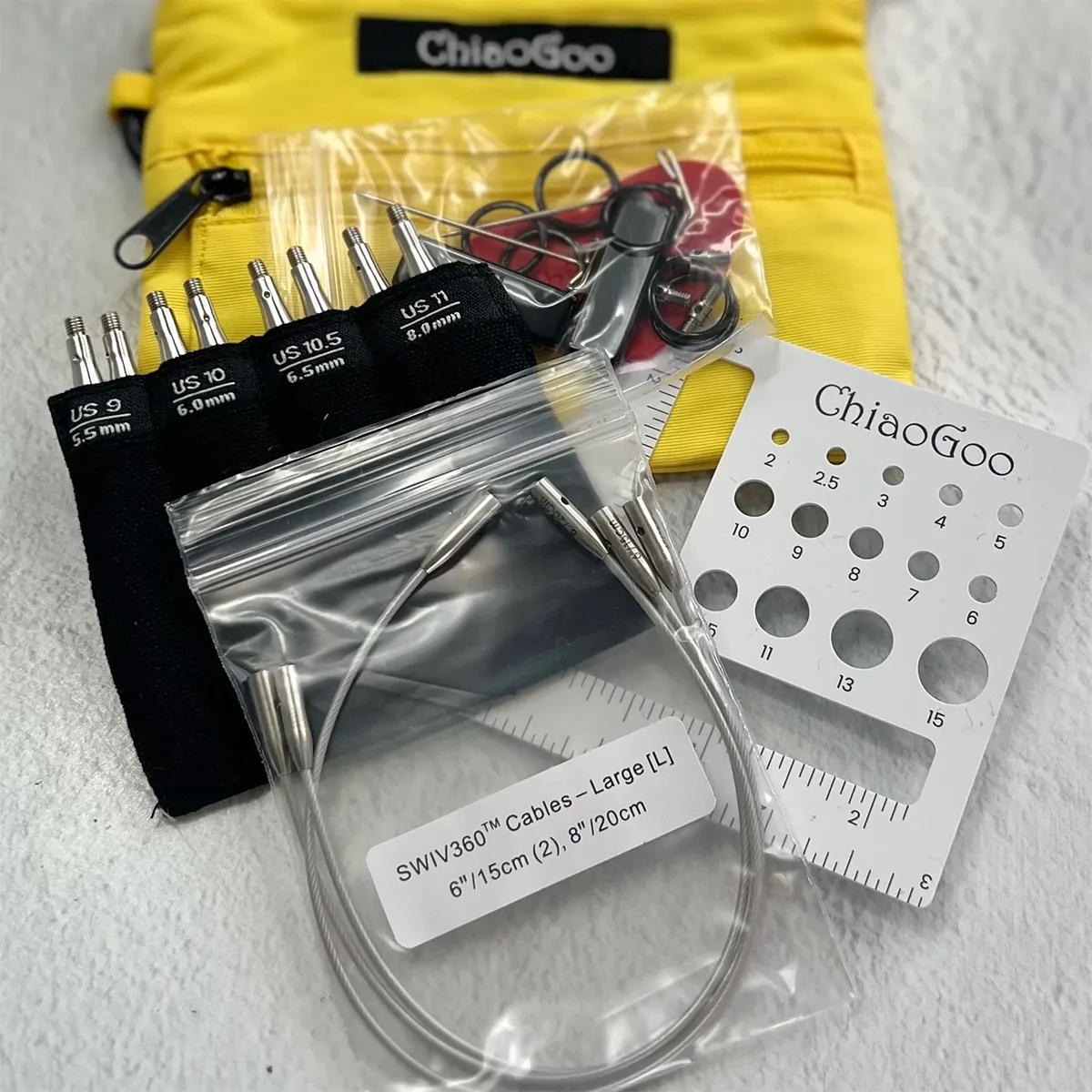 The set comes in a nylon, yellow pocket pouch and includes three SWIV360 cables (two 6" and one 8"), end stoppers, connectors, stitch markers, a swatch/needle gauge, heart-shaped gripper and tip sleeve.