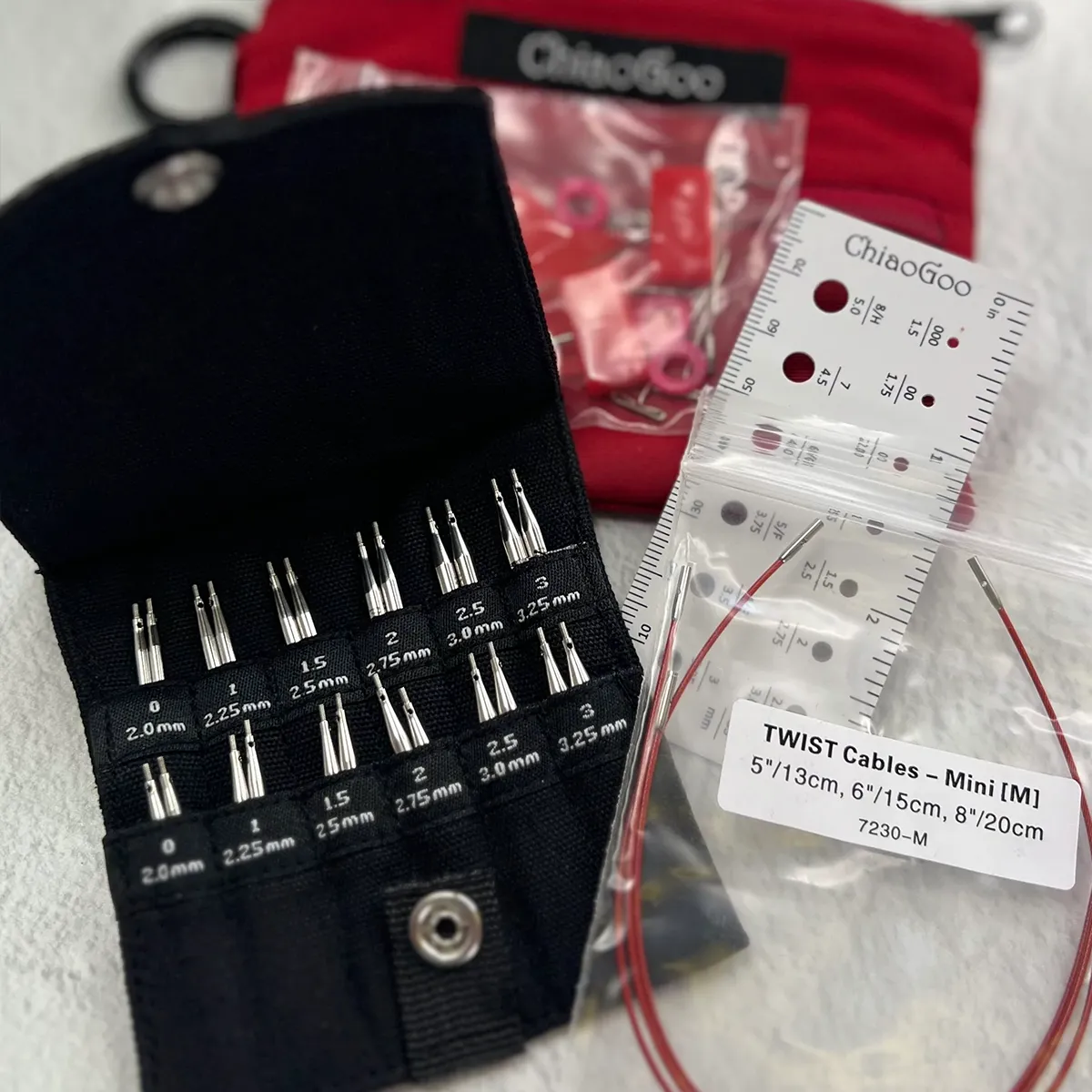 This set includes 12 tips: 6 pairs each of 2" and 3" (5cm/8cm) solid, surgical stainless steel tips sizes US0-3 (2.0-3.25mm) in a secure tip sleeve, three MINI diameter red cables (5"/13cm, 6"/15cm and 8"/20cm) to make 9" through 14" (23-36 cm) circulars, + end stoppers, tightening keys, connectors, stitch markers and a mini needle gauge all in a red, pocket-sized nylon fabric pouch.