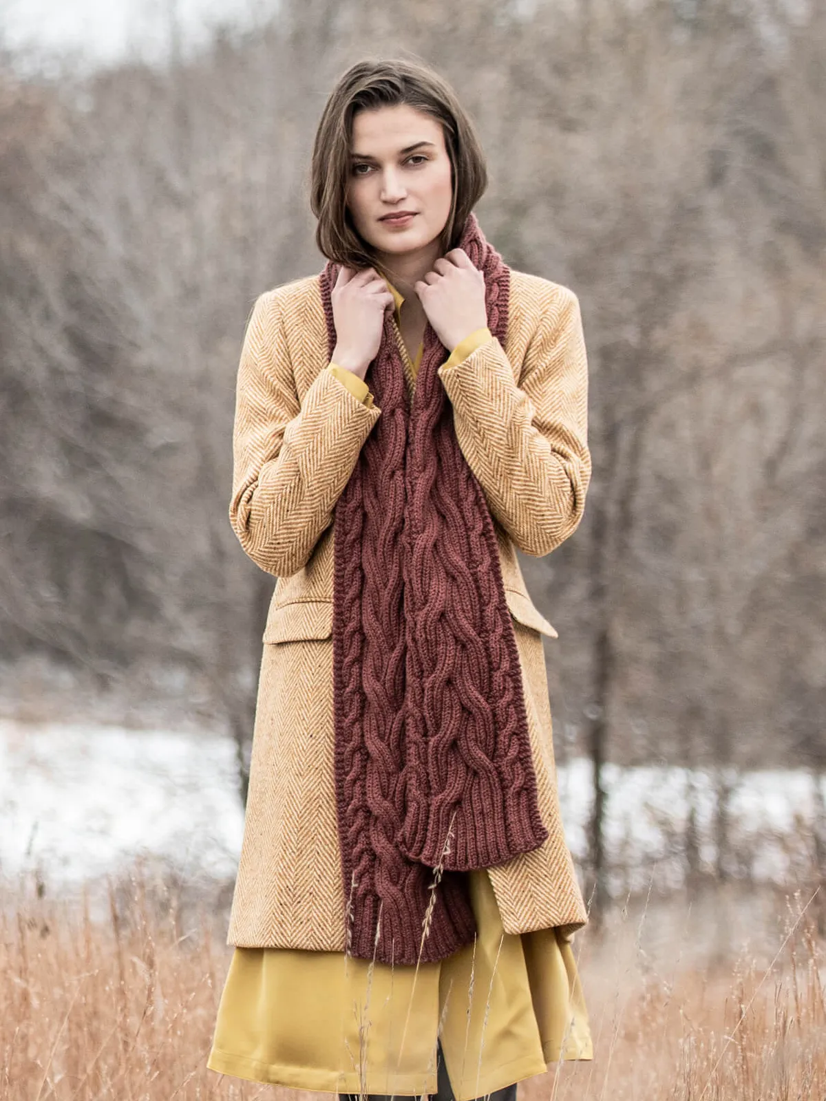 With warmth and style, this reversible cabled scarf is a quick knit with a simple 18 row repeat pattern. Cast on with this light and lofty yarn that is available in colors that match anything. Free pattern included as download with yarn purchase.