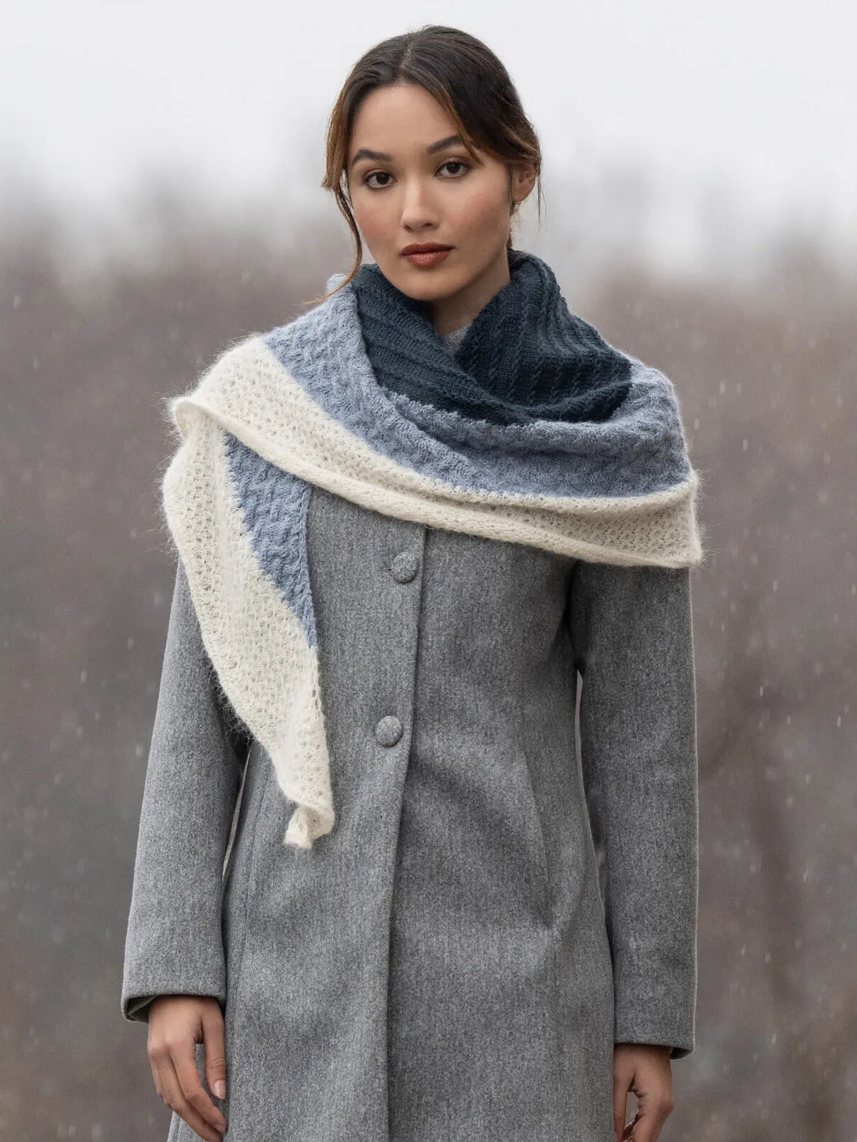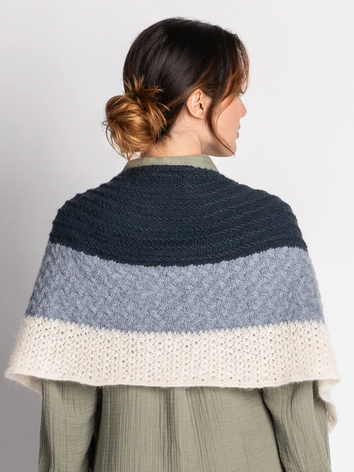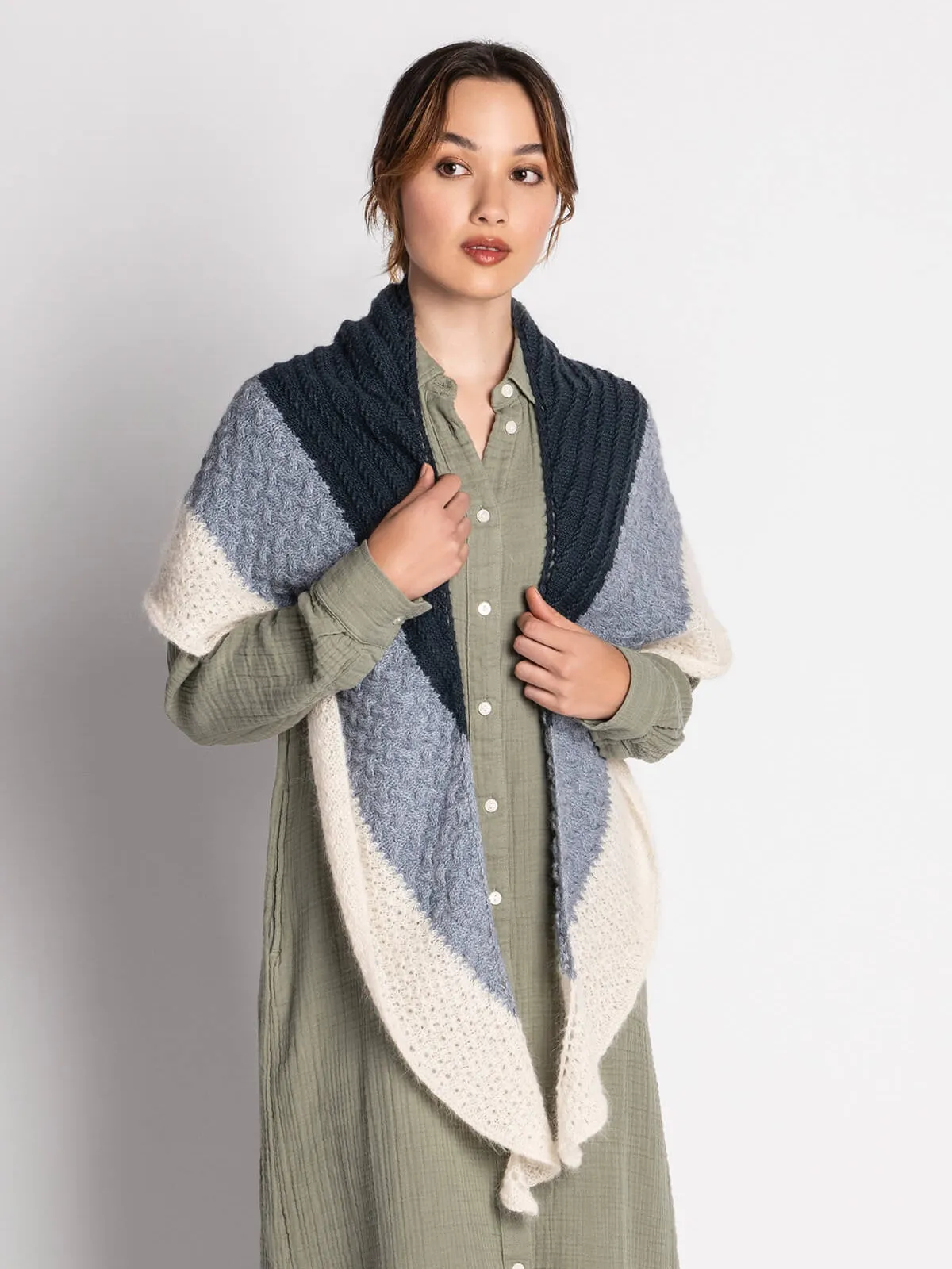 Inspired by the beach at high tide, this crescent shawl unites three parts of the ocean—rolling swells, churning surf, and bubbling shoreline foam—using different stitch patterns, yarn bases, and colors to evoke the character of each. Order Kit as shown, or pick your own colors below and order pattern above.