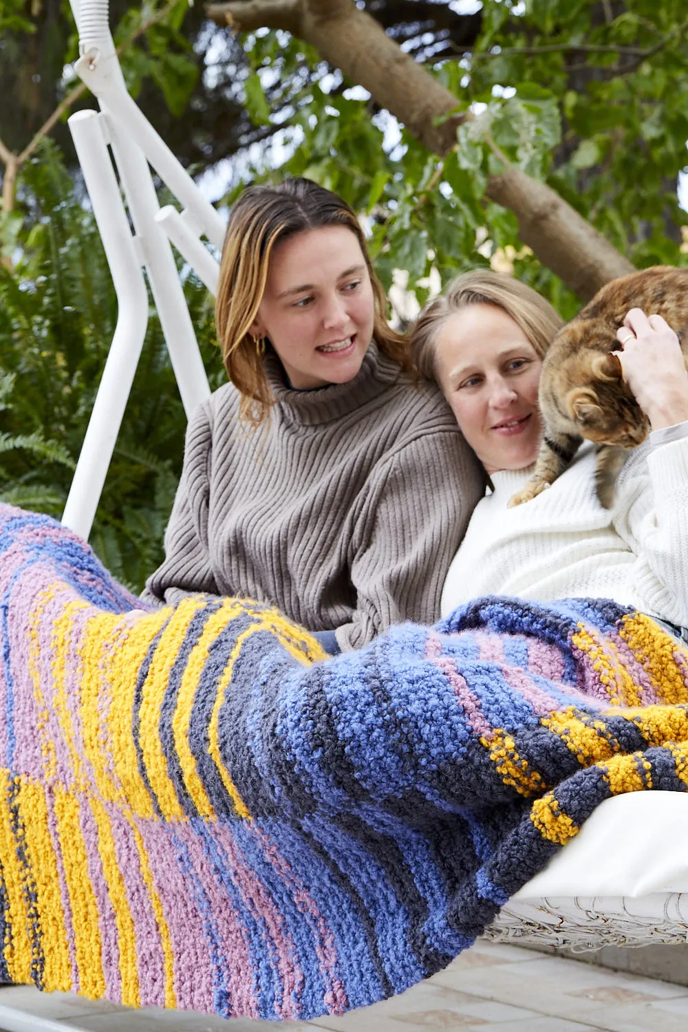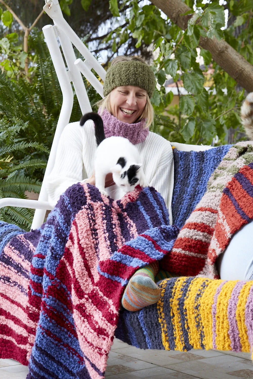 Accoloration is a reversible blanket constructed with 4 color blocks transitioning into each other, connected by Intarsia. The color transition is formed with stripes that get thicker and thinner for a gradient look. The blanket is worked in Garter stitch throughout.